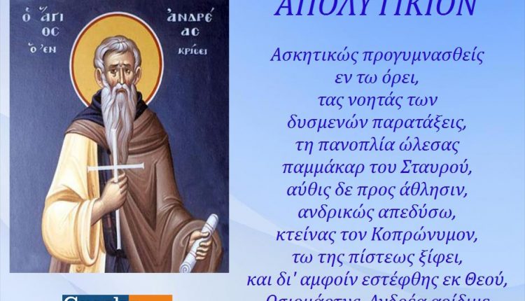 Ασκητικώς προγυμνασθείς εν τω όρει, τας νοητάς των δυσμενών παρατάξεις, τη πανοπλία ώλεσας παμμάκαρ του Σταυρού, αύθις δε προς άθλησιν, ανδρικώς απεδύσω, κτείνας τον Κοπρώνυμον, τω της πίστεως ξίφει, και δι’ αμφοίν εστέφθης εκ Θεού, Οσιομάρτυς, Ανδρέα αοίδιμε.