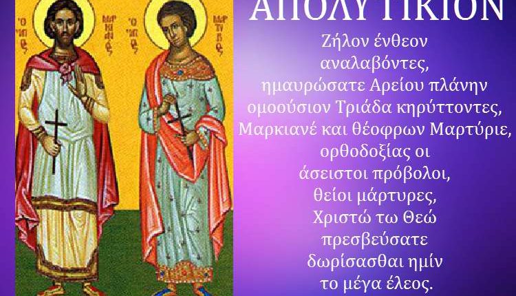 Ζήλον ένθεον αναλαβόντες, ημαυρώσατε Αρείου πλάνην ομοούσιον Τριάδα κηρύττοντες, Μαρκιανέ και θέοφρων Μαρτύριε, ορθοδοξίας οι άσειστοι πρόβολοι, θείοι μάρτυρες, Χριστώ τω Θεώ πρεσβεύσατε δωρίσασθαι ημίν το μέγα έλεος.