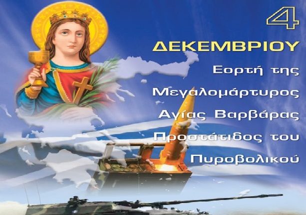 Η Αγία Βαρβάρα θεωρείται όχι μόνο στην Ελλάδα αλλά και σ΄ άλλες Χώρες Αγία προστάτις πυροβολικού. Στην Ελλάδα καθιερώθηκε ως Προστάτις του όπλου αυτού το 1828 μ.Χ. όπου και αναφέρεται η πρώτη σχετική τελετή με δοξολογία και παράθεση στη συνέχεια γεύματος όπου έλαβαν μέρος αξιωματικοί και οπλίτες πυρβολητές.