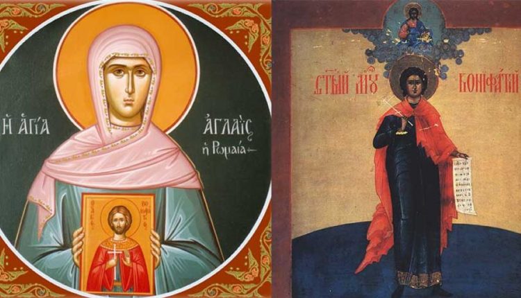 Άγιοι Βονιφάτιος και Αγλαϊς. Έζησαν τον 30 αι. στη Ρώμη. Ο Βονιφάτιος ήταν δούλος της Αγλαίδας. Αποκεφαλίσθηκε γιατί κατηγορούσε δημοσίως για τα μαρτύρια των χριστιανών τον ηγεμόνα. Η Αγλαίς κατόπιν ασκήτεψε.