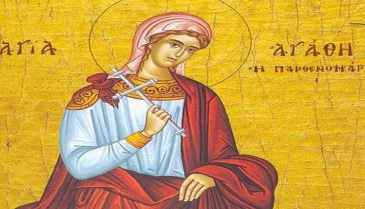 Αγία Αγάθη. Γεννήθηκε στην Κατάνη της Σικελίας, όπου µαρτύρησε κατά το διωγµό του Δεκίου, σε ηλικία µόλις 15 ετών. Η κάρα της φυλάσσεται στη Μονή Αγίου Παύλου του Αγίου Όρους.