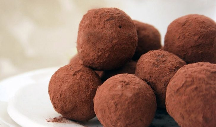 Σ’ένα πιάτο βάζουμε λίγο κονιάκ για να βρέχουμε τα χέρια μας ώστε να μην κολλάει η ζύμη όταν τα πλάθουμε. Δίνουμε όποιο σχήμα θέλουμε στρογγυλό . Λιώνουμε την κουβερτούρα σε μπεν-μαρί και βουτάμε τα τρουφάκια με πιρούνι ένα-ένα μέσα σε αυτή.